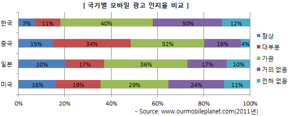 이제는 스마트폰과 무선 인터넷 시장이 성장하고 있다는 이야기가 식상한 뉴스가 되버릴 정도이다. 그렇다면 이런 빠른 성장은 국내만의 현상일까? 해외 시장과 비교한다면 어느 정도의 수준일까? 이번 포스팅에서는 국내 모바일 사용 행태와 다른 국가들(중국, 일본, 미국 등)과 비교하면서 궁금증을 풀어보도록 하자. 대부분의 자료는 ourmobileplanet.com을 참고로 했으며 디테일한 수치는 다소 논란이 있을수 있으니 전체 분위기를 가늠하는데 참고하는 수준으로 받아드리기 바란다.