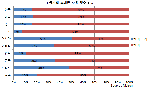 'Second Device을 넘어 Third Device 시대로'에서 소개한 것과 같이 인구보다 높은 휴대폰 보급율을 보이는 국가가 증가하고 있다. 한명의 사용자가 여러개의 휴대폰을 이용하는 사례가 많아지고 있는 것이다. 한개 이상의 휴대폰을 보유하는 한국 사용자는 16% 수준이다. 러시아과 브라질은 각각 51%, 48%의 높은 비중을 보여주고 있다.