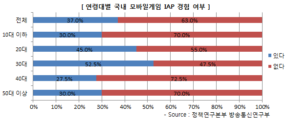 국내도 이러한 상위 그룹의 매출 집중 현상은 크게 다르지 않다. 그렇다면, 이렇게 '큰손'이 되는 그룹을 이해하는게 중요하겠다. 연령별 비중을 먼저 살펴보면 예상대로 20~30대가 높다는 것을 알 수 있다. 20대의 45.0%, 30대의 52.5%가 모바일 게임을 하면서 IAP 경험이 있다고 응답하였다. 모바일 사용에 익숙하면서 구매력이 있기 때문이다.