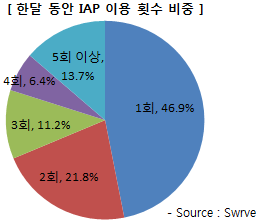 Swrve 보고서에 의하면 한달에 한번 IAP 결제를 하는 사용자는 전체 유료 사용자의 46.9%였다. 13.7%는 한달에 5번 이상 구매를 하는 것으로 알려졌다. 여기에서 흥미로운 것은 2회 이상 결제자들을 살펴보니 첫번째 결제를 한 뒤에 두번째 결제를 하기까지 걸린 시간이 불과 1시간 40여분 밖에 되지 않았다는 사실이다. 한번 결제를 유도하기는 힘들지만 그 뒤부터 충성 고객이 되는 것은 쉬워진다는 이야기가 된다.