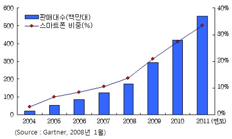 Garner가 2008년 1월에 발표한 자료에 따르면 세계적으로 2006년 0.8억대 수준으로 항상 제자리 걸음을 하던 스마트폰은 2007년 전년대비 46% 성장한 1.2억대를 넘어선 것으로 집계되고 있다. 또한 2008년에는 안드로이드를 비롯한 LiMo등의 새로운 플랫폼에 힘입어 41% 성장한 1.7억대 규모를 유지할 것으로 예측하고 있다. 이는 전체 휴대폰 시장에서 스마트폰이 차지하는 비중이 점점 커진다는 것을 의미하는데 2006년에 8.4%에 불과했던 것이 2007년에는 10%를 넘어선 것으로 집계되었다. 2011년에는 33%에 이를거라는 희망찬 예측이다.
