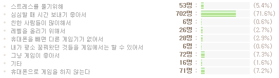 요즘 유행병처럼 번지는 'Go Global'이라는 구호아래에서는 'Game은 재미만 있으면 Global에서 성공할 수 있다'는 의식이 많은 것 같다. 하지만, Local에 따라서 선호하는 장르, 통신 Infra, 선호 UI 등이 차이가 많이 나서 게임 기획시에도 시장에 대한 이해가 필요하다. 그렇다면, 국내 모바일 게임 소비자들은 어떠한 사용 행태를 가지고 있을까? 무선 포탈 모키에서 2009.04.08 ~ 2009.04.30 동안 진행되었던 설문 중 일부분을 통해 짐작을 해보도록 하자.