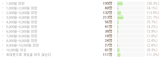 응답자 중 약 64%정도가 게임 플레이를 하는데 가장 불편한 점을 '요금'을 이야기 했다. 그리고, 모바일 게임의 정보이용료에 들어가는 비용에 대해 응답자의 약 60%가 4,000원 미만이라고 답을 했다. 실제 게임을 다운로드 하기 위해서는 패킷요금을 지불해야 하니, 정보이용요금만 가지고 이야기 하기는 어려우나 전반적으로 낮은 소비행태를 보이고 있는 것은 사실이다.